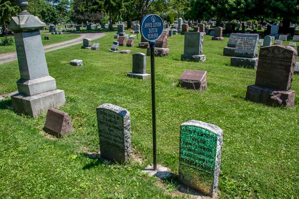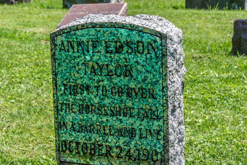 Among those buried at Oakwood, one can find Annie Edson Taylor, the first person to ever travel over the Horseshoe Falls in a barrel. Taylor had hoped her exploit would bring more fortune than fame, but alas she died in a poor economic state.